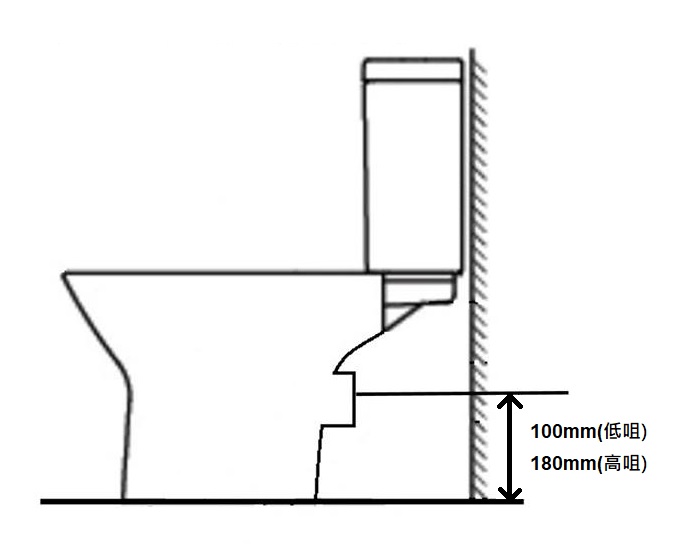 高咀係指座廁嘅去水位的中位離地180mm(約7吋)左右,現時市面上大部份嘅樓宇設計去水位都係高咀。另外,即使原有大廈嘅去水位係低咀,都可以用相應嘅接駁咀去安裝高咀座廁,唯要注意安裝後會否空間不足而導致水箱離牆。
